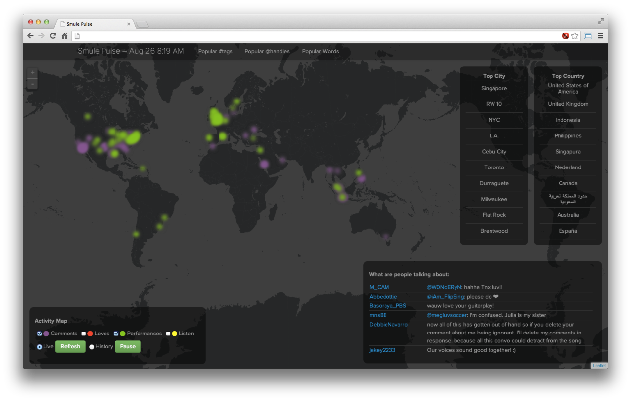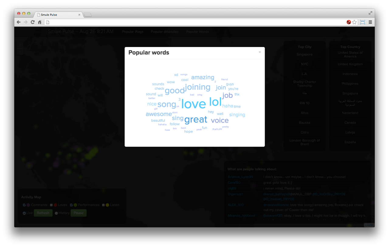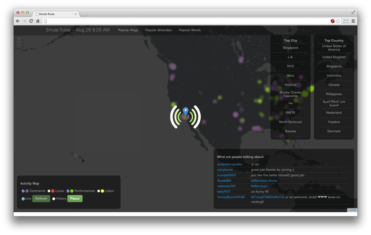 We are mostly server guys, so we tried to answer the question: What’s happening at the moment in Smule nation?. We wanted to sense the pulse of the community. So we built “Smule Pulse”.